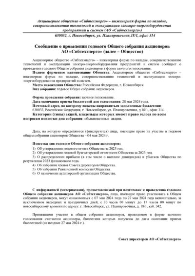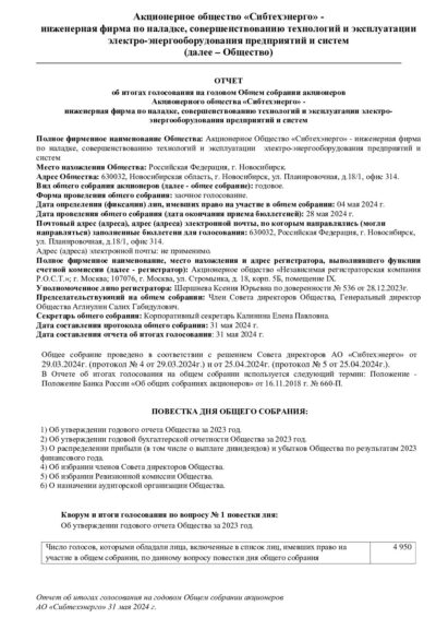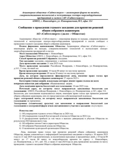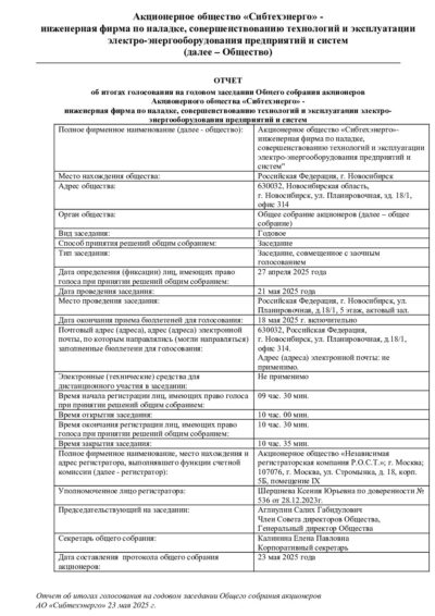 Здесь публикуются ключевые документы о корпоративной деятельности общества — сообщения об общих собраниях акционеров и отчёты об итогах голосования для информирования участников.
