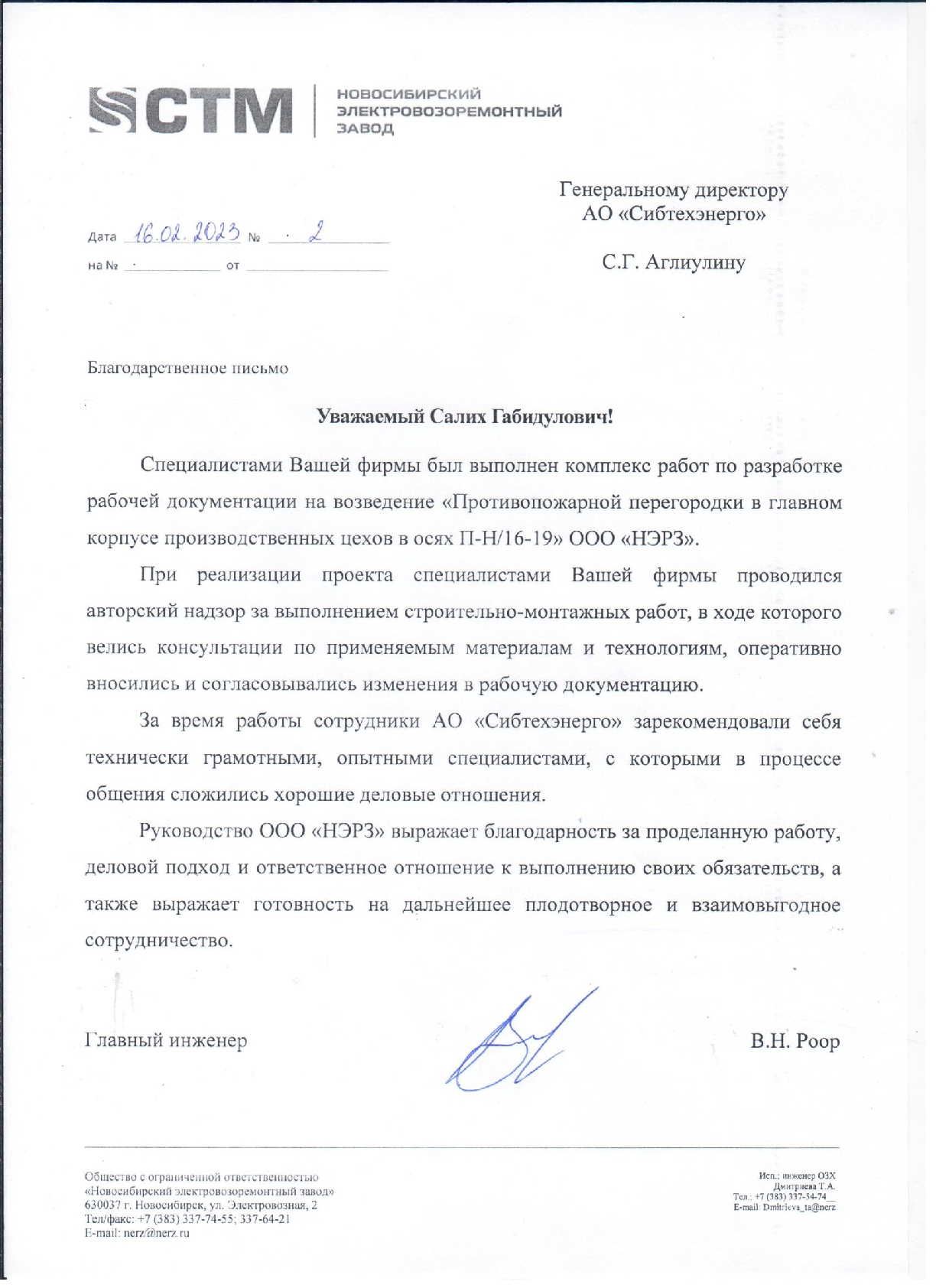 АО "Сибтехэнерго" получило отзыв о выполнении комплекса работ по разработке рабочей документации на возведение "Противопожарной перегородки в главном корпусе производственных цехов в осях П-Н/16-19" ООО "НЭРЗ"