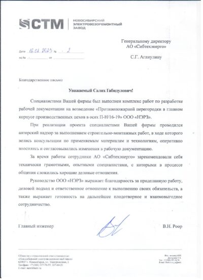 АО "Сибтехэнерго" получило отзыв о выполнении комплекса работ по разработке рабочей документации на возведение "Противопожарной перегородки в главном корпусе производственных цехов в осях П-Н/16-19" ООО "НЭРЗ"