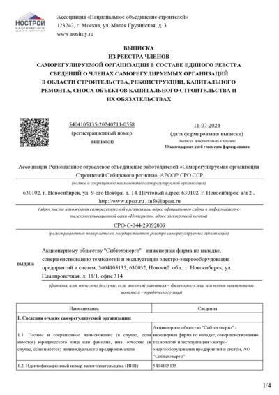 Выписка из реестра членов АРООР «Саморегулируемая организация строителей Сибирского региона»