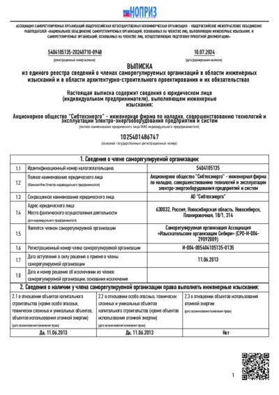 Выписка из реестра членов Ассоциации организаций, осуществляющих проектирование энергетических объектов «ЭНЕРГОПРОЕКТ»