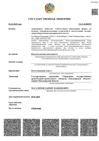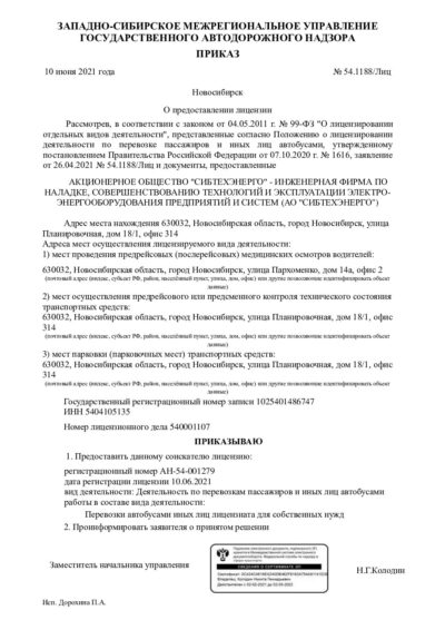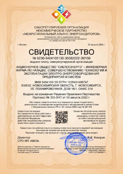 АО «Сибтехэнерго» имеет все необходимые разрешительные документы для выполнения работ на предприятиях энергетической отрасли в Российской Федерации и в Республике Казахстан, а также специальные свидетельства и сертификаты, подтверждающие компетенцию фирмы по дополнительным направлениям деятельности