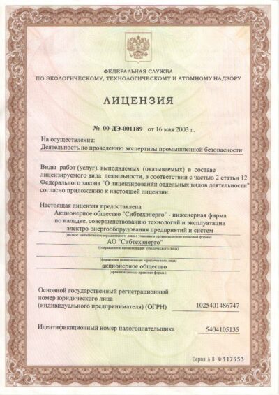 Лицензия Ростехнадзора на осуществление деятельности по проведению экспертизы промышленной безопасности