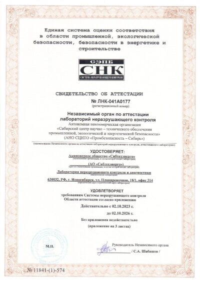 Свидетельство об аттестации лаборатории неразрушающего контроля и диагностики